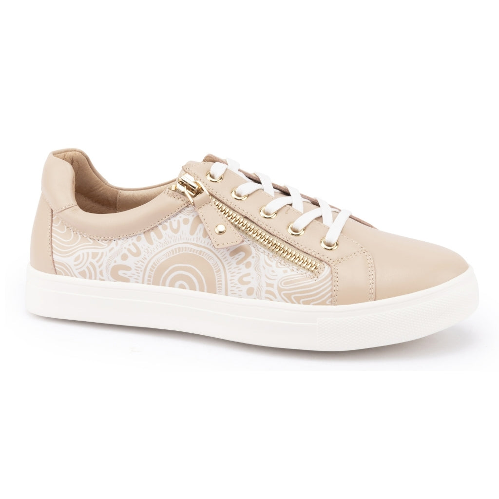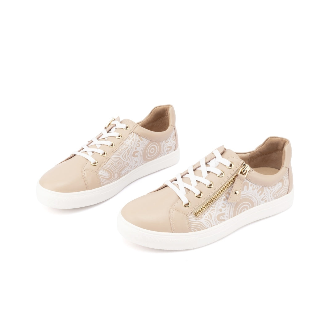 Step into the Cara Kard Combo, a sneaker collaboration with Noongar artist Peter Farmer. Featuring the symbolic Mountains artwork and premium leather accents, this sneaker combines style, culture, and comfort with Klouds' signature Arch Comfort Zone Insole, shock-absorbing rubber foam outsole, and adjustable fit for ultimate support.